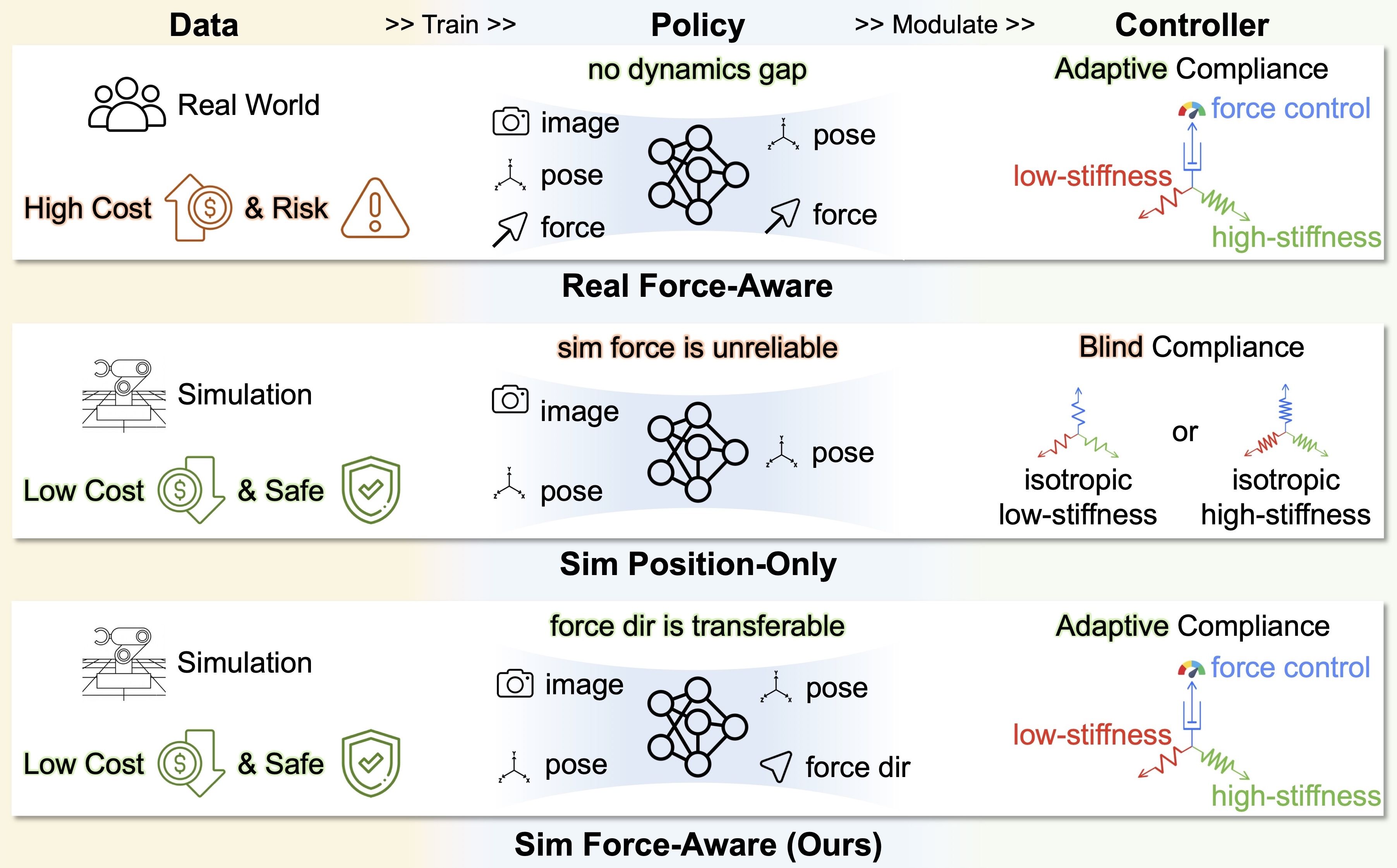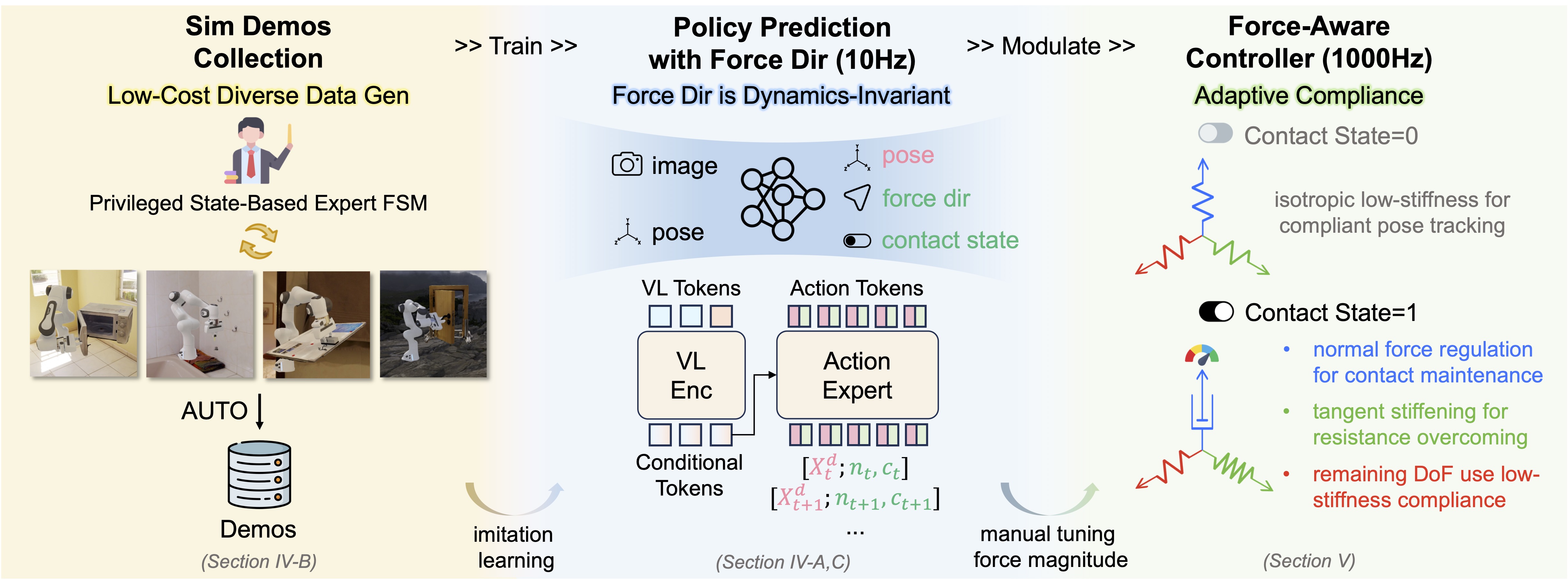 In simulation, we implement an expert Finite State Machine based on privileged state to generate diverse demonstrations. Identifying force direction and contact state as dynamics-invariant quantities that encode task intent, the policy is trained to predict these signals alongside poses using simulation data. In the real world, the policy outputs configure a force-aware admittance controller, which combines the predicted force direction with a manually specified magnitude to achieve adaptive, task-aligned compliance.